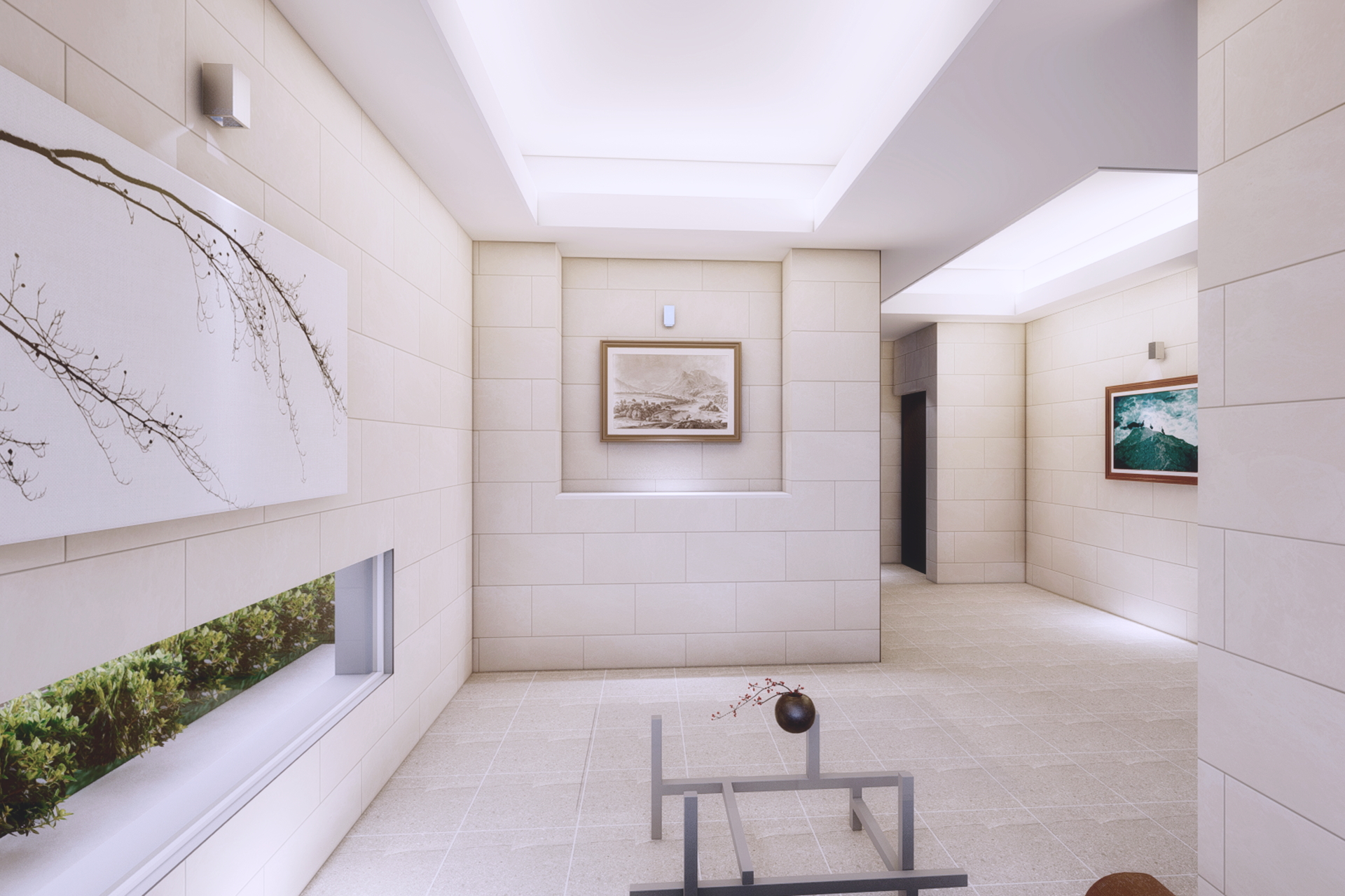 壁面を彩った絵画たちと共に、くつろぎを感じていただける空間で少しお待ちください。EVの到着はまもなくです。
