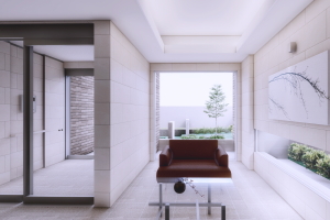 敷地内の植栽風景を切り取る大きな窓。オートロックはハイブリッドなIC錠により、タッチレスで自動に開きます。